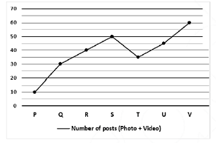 Direction: In the given below line chart, total number of posts(photo + video) posted by each person P, Q, R, S, T, U, V on their social media profile is given.