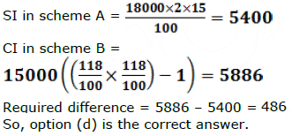 Rs 18000 is invested in scheme ‘A’ by ram which offers 15% p.a. at simple interest and Rs 15000 in scheme ‘B’ which offers 18% p.a at compound interest. Find the difference betweenthe interests earn from these two schemes after two years?