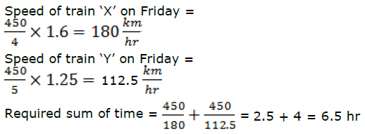 On Friday, speed of train ‘X’ increases by 60% and speed of train ‘Y’ increases by 25% as compared to Thursday, then find the sum of the time taken by both trains separately to cover the same distance?