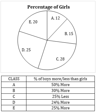 Direction (): Study the following data carefully and answer the following questions. The pie chart shows the percentage distribution of total girls in five different classes in March month of 2019 and table shows the percentage of boys more or less than the girls in respective class for the same month and year.