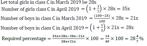 In April 2019, number of girls and boys in class C are increased by 14(2/7)% and 33(1/3)% respectively as compared to previous month. Total students in class C in April 2019 are what percent more or less than total students in class C in March 2019 ?