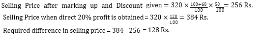 Cost price of article D is Rs.320. If article D is sold at 20% profit rather than marking up and giving discount, then find the difference between the selling price obtained in both cases. (in Rs.)