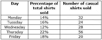 Direction (): Study the following information carefully and answer the questions given below. In the table, percentage of shirts (formal and casual) sold out of the total number of shirts sold in the week and number of casual shirts sold data related to the number of shirts sold on five week days – Monday, Tuesday, Wednesday, Thursday and Friday are given. Total number of shirts sold in the week = x