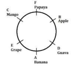 Six persons A, B, C, D, E, and F are seated around a circular arrangement facing the centre. Each of them like different fruits, viz. Banana, Mango, Grape, Papaya, Guava, and Apple. The one who likes Guava sits to the immediate right of A. C likes Mango and sits third to the right of D. B sits second to the left of C. B likes neither Papaya nor Grape. A is adjacent to neither C nor F. The one who likes Grapes sits second to the right of the one who likes Papaya. E is adjacent to the one who does not like Apple.