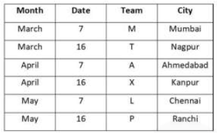 Six teams- A, T, M, X, L and P have their matches on two different dates i.e. 7th and 16th of three months i.e. March, April and May. All the matches are played in different cities i.e. Mumbai, Nagpur, Kanpur, Ahmedabad, Chennai and Ranchi. Team X has a match in the month having 30 days. Two teams have a match between Team X and the match played in Mumbai. Three teams have matches between the match played in Mumbai and the match played in Chennai. One team has a match between Team A and the match played in Chennai. The match played in Kanpur is just played after Team A. Team T played the match just before the match played in Ahmedabad. T played a match on an even-numbered date. Two teams have a match between Team P and the match played in Ahmedabad. Team L played the match just before the match played in Ranchi. Team M does not play in Chennai.