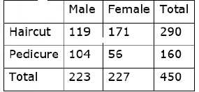 Say haircut voucher =H pedicure voucher P =H-130 H+P= 450, H=290, P=160 Male getting pedicure= 160*(13/20) = 104 Female Getting Pedicure= 160*(7/20) = 56 Male Haircut= 104 +15=119 Female haircut= 290-119= 171