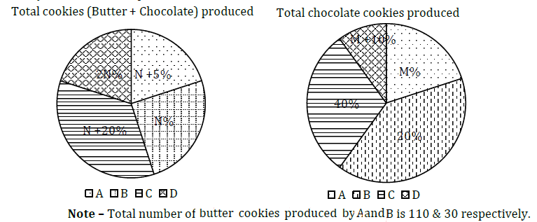 For total cookies produced pie chart 2N% + (N + 5)% + N% + (N + 20)% = 100% (5N + 25) % = 100% 5N = 75 N = 15 Let total cookies produced by all four companies = 100x So, total cookies produced by A = 100x ×(15+5)/100 = 20x Total cookies produced by B = 100x × 15/100 = 15x Total cookies produced by C = 100x ×(15+20)/100 = 35x Total cookies produced by D = 100x ×2×15/100 = 30x Similarly, for total chocolate cookies produced pie chart (M + 10) % + M% + 20% + 40% = 100% (2M + 70) % = 100% 2M = 30 ⇒ M = 15