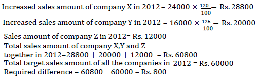 If sales amount of company X and Y in 2012 increases by 20% and 25% respectively and sales amount of company Z remains constant, then find the difference between total target sales amount of all these companies in 2012 and sales amount of these 3 companies together as per the above condition?(in Rs.)