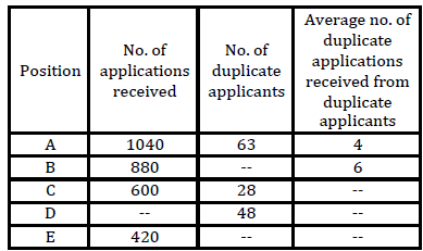 Directions (): Read the data carefully and answer the questions. Some data are missing which you have to calculate as per information provided in the questions. NOTE:- A duplicate applicant is an applicant who has submitted additional (duplicate) application after submitting their original application. All application forms (original + duplicate) received from duplicate applicant were rejected. Remaining all application were accepted. None of the applicants applied for more than one post.