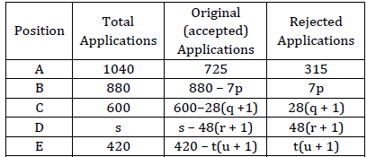 All applicants who submitted more than one application, their original submission is also rejected. FOR POSITION A: 63 applications were declared duplicate since these 63 applicants submitted more than one application Total rejected applications = 63+63×4=315 Following the same, we get