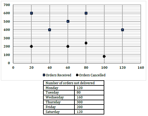 Directions (): Given graph shows the number of orders received and cancelled on particular days of a week (From Monday to Saturday) while the table shows the number of orders which were not delivered. Read the data carefully and answer the questions. (NOTE: Refer Y-Axis values as number of orders while X-Axis values as Days i.e. 20 = Monday, 40 = Tuesday and so on) (Orders continued/booked are those which are not cancelled) Some data is missing in the given graph. Orders Booked = Orders Received – Orders Cancelled Orders Delivered = Orders Booked – Orders not delivered
