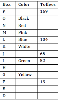 If box F have 13 toffees, then which of the following is Pink colored box?