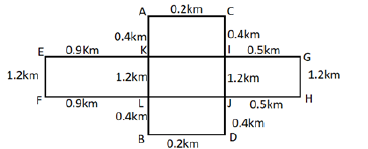 Direction () :Study the following information to answer the given questions. A, B, C and D are the corners of a rectangular field such that A is to the North of B. C is 0.2km to the East of A. The longer side of the rectangular field is 2km. E, F, G and H are the corners of an another rectangular field such that E is 1.6km to the west of G. H is 1.2km to the south of G and in the East of F. Rectangle field EFGH intersects the line joining AB and CD at KL and IJ respectively. It is also known that K is 0.9km towards the East of E and J is 0.4km towards the North of D.