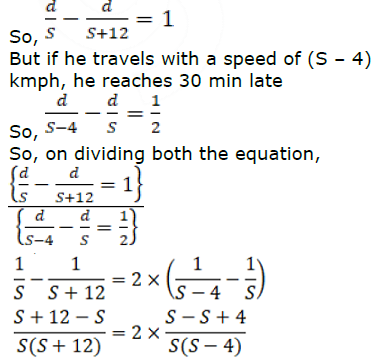 Vikram travel a certain distance from point X to Y with a speed S kmph. If he travels the same distance with a speed (S+12) kmph, he reaches his destination 1 hour before. But if he travels with a speed of (S – 4) kmph, he reaches 30 min late. Which of the