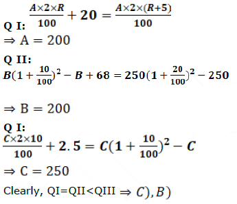 Quantity I: Value of A, If the interest received by Rama invested Rs. A in simple interest for 2 years at the rate of R% per annum is 20 less than the interest received by him the same sum invested him in simple interest for 2 years at the rate of (R+5)% per annum.