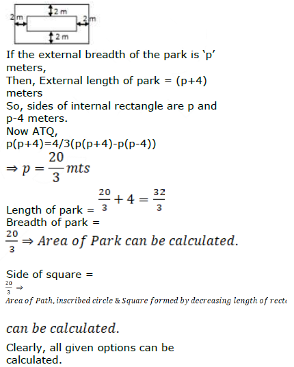 There is a path of uniform width, 2 meters around it inside a rectangular park. If the length of the par decreases by 4 meters, it converts into a square. If Area of path =4/3 x Area of rectangular park (Pathincluded).Which of the following canbe deduced from the given information: