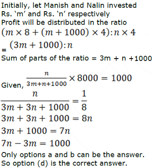 Manish and Nalin entered into a partnership and invested Rs. __________ and Rs. __________ respectively. After 8 months, Manish invested Rs. 1000 more and Nalin withdraw its money after 4 months. At the end of the year the value of the profit was Rs. 8000 and the value of Nalin’s share was Rs. 1000 . The values given in which of the following options will fill the blanks in the same