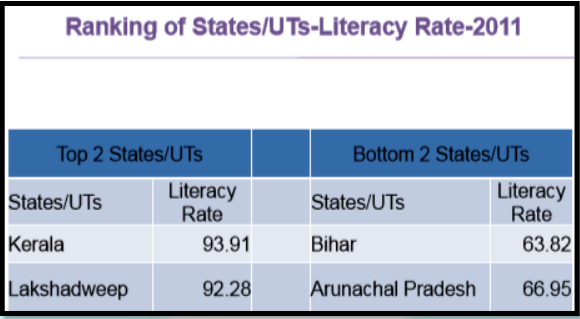 • Literacy rate in India as per Census 2011: 74%. • Literacy rate: Male: 82.1%; Female: 65.5% • Kerala tops the rankings, followed by Delhi, Maharashtra and Tamil Nadu. • Bihar is the lowest among states, followed by Arunachal Pradesh, Rajasthan, Jharkhand etc., however, they are improving their position. • Bihar has a literacy rate of 63.8%, and that of women is 53.3%. • Literacy rates for both adults as well as youths have increased, still, the absolute number of illiterates in India is as much as India’s population was at the time of independence. • The gender gap in terms of literacy began to narrow first in 1991 and the pace has accelerated, however still lags far behind global female literacy rate of 7% (UNESCO 2015). • There are large state variations in the gender gap. • However during 2001 – 2011, male literacy rate increased by 6 percentage points but female literacy increased by nearly 12 percentage points. Achievement in female literacy in Bihar is noteworthy: from 33% in 2001 to 53% in 2011. • Be that as it may, India is still lagging behind the world literacy rate of 86.3%(UNESCO 2015). A major group of states lies in the average rank i.e. just above the national level of 64.8 percent.