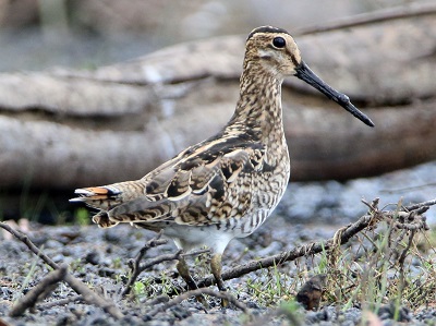 The bird is identified as a Gallinago snipe by its cryptically-patterned black, brown, buff and white plumage. However, it is not easy to distinguish from Swinhoe’s and pin-tailed snipe.