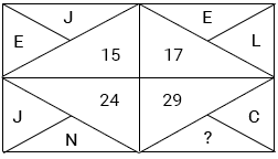 Positions of alphabets (A to Z) is(1-26) J+E=10+5=15; J+N=10+14=24; E+L=5+12=17. Value of C is 3 and value of missing letter is (29-3) is 26. Letter would be Z. Hence, option 2 is the correct answer.