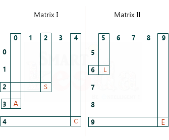 A word is represented by only one set of numbers as given in any one of the alternatives. The sets of numbers given in the alternatives are represented by two classes of alphabets as in two matrices given below. The columns and rows of Matrix I are numbered – form 0 to 4 and that Matrix II are numbered from 5 to 9. A letter from these matrices can be represented first by its row and next by its column, e.g., ‘A’ can be represented by 01, 14, etc. and E can be represented by 55, 66 etc. Similarly, you have to identify the set for the word ‘SCALE’.