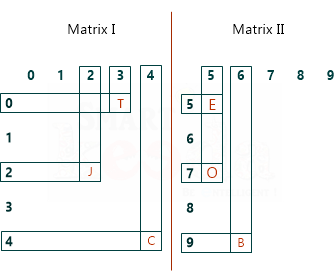 A word is represented by only one set of numbers as given in any one of the alternatives. The sets of numbers given in the alternatives are represented by two classes of alphabets as in two matrices given below. The columns and rows of Matrix I are numbered – form 0 to 4 and that Matrix II are numbered from 5 to 9. A letter from these matrices can be represented first by its row and next by its column, e.g., ‘J’ can be represented by 01, 14, etc. and E can be represented by 55, 66 etc. Similarly, you have to identify the set for the word ‘OBJECT’.