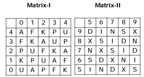 As per above given matrices I and II , we can see that S ⇒ 98, 86, 77, 65, 59 I ⇒ 96, 87, 78, 69, 55 X ⇒ 99, 85, 76, 67, 58 K ⇒ 42, 31, 23, 10, 04 D ⇒ 95, 88, 79, 66, 57 As shown in given figure , all the values for word SIX-KIDS are matched in only option ( 2 ) for every letter . So , the set for the word SIX-KIDS will be 98, 96, 85 – 42, 78, 88, 77 Hence, option 2 is the correct answer.