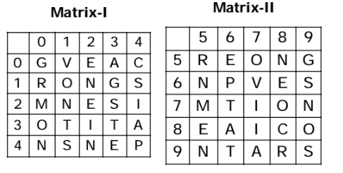 As per above given matrices I and II , we can see that R ⇒ 10, 55, 98 E ⇒ 02, 22, 43, 56, 68, 85 S ⇒ 14, 23, 41, 69, 99 T ⇒ 31, 33, 76, 96 As shown in given figure , all the values for word REST are matched in only option ( 4 ) for every letter . So , the set for the word REST will be 55, 22, 99, 33 . Hence, option 4 is the correct answer.