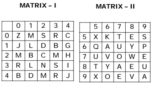 In each of the following questions, a word is represented by only one set of numbers as given in any one of the alternatives. The sets of numbers given in the alternatives are represented by two classes of alphabets as in two matrices given below. The columns and rows of Matrix I are numbered from 0 to 4 and that of Matrix II are numbered from 5 to 9. A letter from these matrices can be represented first by its row and next by its column, e.g. ‘E’ can be represented by 01, 13, etc. and ‘L’ can be represented by 56, 77 etc. Similarly, you have to identify the set for the word given LANE.