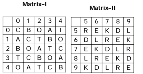 From above given matrices I and II , we can see that B ⇒ 01, 13, 20, 32, 44 E ⇒ 56, 68, 75, 87, 99 A ⇒ 03, 10, 22, 34, 41 K ⇒ 57, 69, 76, 88, 95 From given matrix it is clear that all the values for word BEAK are matched in only option ( 1 ) for every letter . So , the set for the word BEAK will be 44 ,75 ,22 ,88