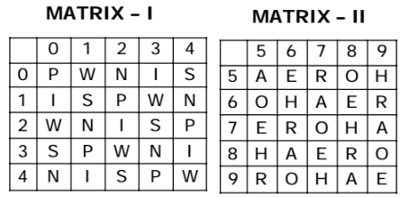 From above given matrices I and II , we get different values for all given letters in matrices - P ⇒ 00, 12, 24, 31, 43 E ⇒ 56, 68, 75, 87, 99 N ⇒ 02, 14, 21, 33, 40 S ⇒ 04, 11, 23, 30, 42 From given matrix it is clear that all the values for word PENS are matched in only option ( 3 ) for every letter . So , the set for the word PENS will be 43, 56, 21, 42 .