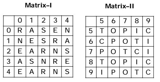 From above given matrices I and II , we get different values for word PERSON - P ⇒ 57, 66, 75, 87, 96 E ⇒ 03, 11, 20, 34, 40 R ⇒ 00, 13, 22, 33, 42 S ⇒ 02, 12, 24, 31, 44 O ⇒ 56, 67, 76, 86, 97 N ⇒ 04, 10, 23, 32, 43 From given matrix it is clear that all the values for word PERSON are matched in only option ( 4 ) for every letter . So , the set for the word PERSON will be 87, 11, 22, 24, 67, 04 .