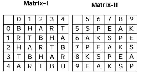 From above given matrices I and II , we can see that T ⇒ 04, 11, 23, 30, 42 A ⇒ 02, 14, 21, 33, 40, 58, 65, 77, 89, 96 K ⇒ 59, 66, 78, 85, 97 E ⇒ 57, 69, 76, 88, 95 As shown in given figure , all the values for word TAKE are matched in only option ( 1 ) for every letter . So , the set for the word TAKE will be 23, 21, 85, 95 .