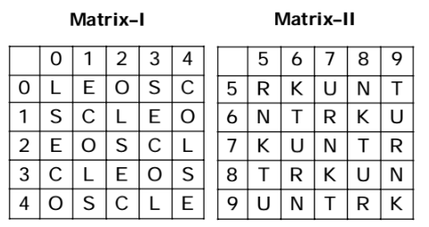 From above given matrices I and II , we have C ⇒ 04, 11, 23, 30, 42 O ⇒ 02, 14, 21, 33, 40 R ⇒ 55, 67, 79, 86, 98 K ⇒ 56, 68, 75, 87, 99 As shown in given figure , all the values for word CORK are matched in only option ( 3 ) for every letter . So , the set for the word CORK will be 11, 40, 55, 75