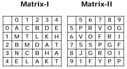 M ⇒10, 21 A ⇒ 00, 23, 34, 42 G ⇒ 59, 78, 86 I ⇒ 69, 89, 95 From given matrix it is clear that all the values for word MAGI are matched in only option ( 1 ) for every letter . So , the set for the word MAGI will be 21, 42, 86, 69 .