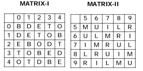 Given below are two matrices of 25 cells each containing two classes of alphabets The columns and ro...........