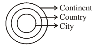 Select the venn diagram that correctly shows the relationship. Continent , City and Country