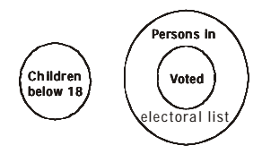 According to above given question , we can say that children below 18 are different from persons in the electoral list and those who have voted. From above it is clear that option ( 1 ) represents the best relationship between children below 18, persons in the electoral list and those who have voted.