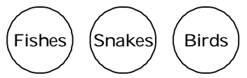 Which one of the following diagrams best depicts the relationship among Fishes, Snakes and Birds?