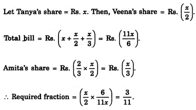 Three friends had dinner at a restaurant. When the bill was received, Amita paid 2/3 as much as Veena paid and Veena paid 1/2 as much as Tanya paid. What faction of the bill did Veena pay ?