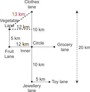 From the following explanation it is clear that if the distance between fruit lane and inner circle is 12m, then the shortest distance between vegetable lane and clothes lane is 13m.
