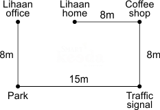 Lihaan walks 8m towards south from his office to reach park. Then take left and walks 15m to reach traffic signal. Then he turns 90 degree anti-clock wise direction and walks 8m to reach coffee shop. From the coffee shop he takes left and walks 8m to reach home.