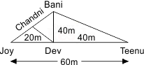 Five friends Teenu, Bani, Chandni, Dev and Joy are playing Hide and Seek and standing randomly. Bani is to the northeast of Joy. Dev is 20 m to the east of Joy, who is 60 m to the west of Teenu. Chandni is to the northwest of Dev and in the line of Joy and Bani. Dev is 40 m to the south of Bani.