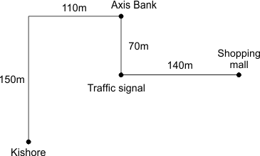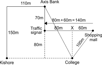 Colleges of both Kishore and Lokesh are in east direction with respect to their room. Therefore, Kishore's college is exactly in the east direction of Kishore's room. Let X be the point between Traffic signal & Shopping mall (not exactly.) To find the shortest distance between X and shopping mall. √1002 – √802 = √10000 – √6400 = √3600 = 60m By this, we get to know that distance between the traffic signal and X = 140m – 60m = 80m To find the shortest distance between Axis bank and college √1502 + 802 =√ 22500 + 6400 = √28900 = 170m