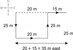 Rajesh walked 25 meters towards South. Then he turned to his left and walked 20 meters. He then turned to his left and walked 25 meters. He again turned to his right and walked 15 meters. At what distance is he from the starting point and in which direction?