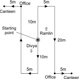 Ramlin and Divya are two friends. They start walking from same point but in opposite direction. Ramlin walks towards north. After walking 10km Ramlin takes a right turn and walks for 5km then turns 90 degree in clockwise direction and walks 20km to reach his office and then takes a left turn and walks 5km to reach canteen. Divya also follows the same condition as Ramlin.