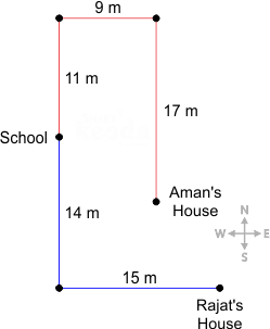 Aman started from his school, walks 11 m towards the north then takes a right turn and walks 9 m after that he takes right turn again, walks 17 m and stops at his house. Rajat also starts from the same School, walks 14 m towards the south, then takes a left turn and walks 15 m before stopping at his house.