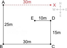 Point B is 25 m south of point A. Point C is 30 m east of point B. Point D is 15 m north of point C. Point E is 10 m west of point D.