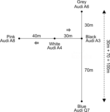 In an Audi showroom there are five cars namely Audi A3, Audi A4, Audi A8, Audi A6 and AudiQ7. The colors of the cars are Black, White, Pink, Grey, and Blue respectively. All the cars were parked in a showroom facing towards north direction. Audi A3 car is parked 30m to the right of White color car. Blue color car is parked 70m to the south of Audi A3 car. Audi A8 car is parked 40m to the west of Audi A4 car. Grey color car is parked 100m to the north of Blue color car.