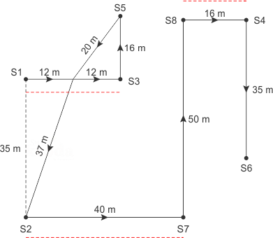 Ankush went to the market to visit eight shops – Shop-1, Shop-2, Shop-3, Shop-4, Shop-5, Shop-6, Shop-7 and Shop-8, but not necessarily in the same order. He starts from Shop-1 and walks towards Shop-3 which is at distance of 24 m towards east. He then turns left and walks 16 m to reach Shop-5. Then he walks 57 m southwest to visit Shop-2, which is towards the south of Shop-1, crossing the path which goes through the midpoint of the line joining Shop-1 and Shop-3. After visiting Shop-2, he walked 40 m in east direction and reached Shop-7. He then walked 50 m left to reach Shop-8 and then walked 16 m right to reach Shop-4 and to reach the last shop he walked 35 m towards right.